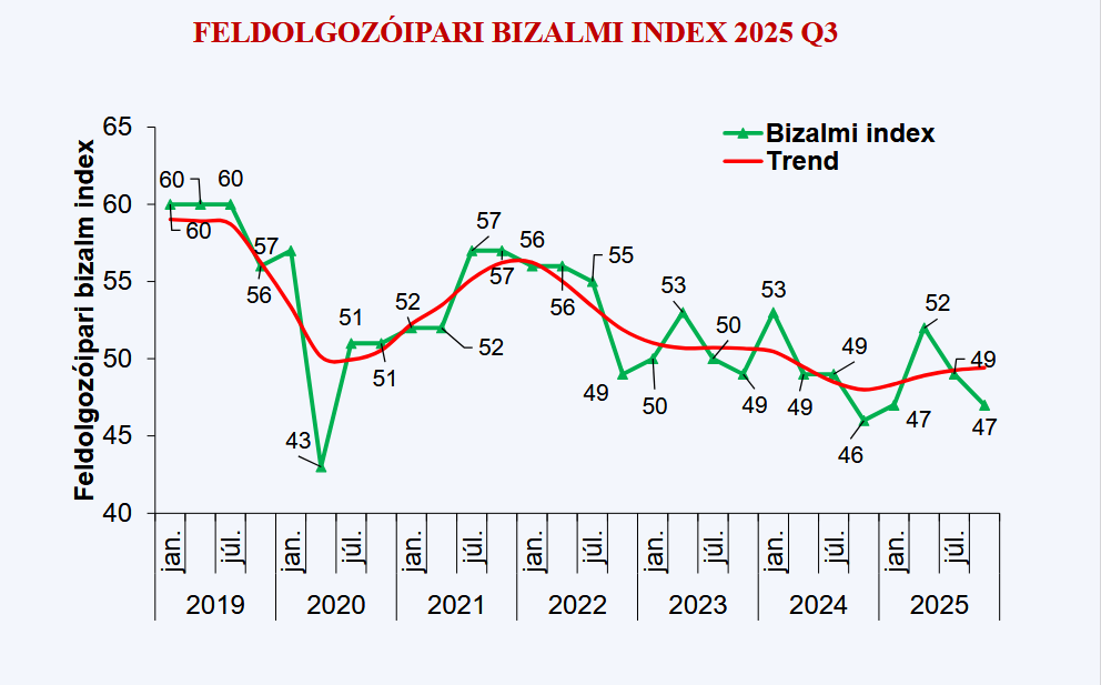 A 2025 októberében készült feldolgozóipari konjunktúrateszt szerint a harmadik negyedévben a barométer stagnálást jelzett. Eközben a bizalmi index a hibahatáron belül ugyan, de határozottan folytatta a csökkenést a nyári felméréshez képest, egy újabb lejtő veszélyét rejtve magában. A hangulat a nagyobb vállalatok esetében javulóban van, de nem eléggé az erős toborzási szándékhoz. A termelést akadályozó tényezők között – mint három éve folyamatosan – legsúlyosabb még mindig a kereslethiány.